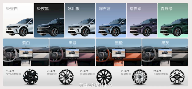 焕新极氪7X基于SEA浩瀚架构打造,依旧延续了现款的设计风格,提供多达六种车身配色和四种内饰配色,并提供19-21英寸不同尺寸的轮圈。