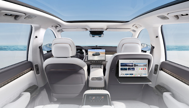 新车顶棚采用麂皮绒材质,四门双层夹胶玻璃提升静谧性,后排标配石墨烯加热座椅、电动躺椅、355mm连体电动腿托、电动遮阳帘和6英寸中央扶手智慧屏,可选装- 6℃~50℃冷暖冰箱和13英寸OLED后排娱乐屏。
