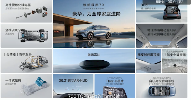 搭载千里浩瀚辅助驾驶系统 H7,标配31颗感知硬件(含1颗激光雷达)和英伟达Thor-U 芯片(算力700TOPS),支持无图城市 NZP、D2D 车位到车位领航、APA 自动泊车等功能。